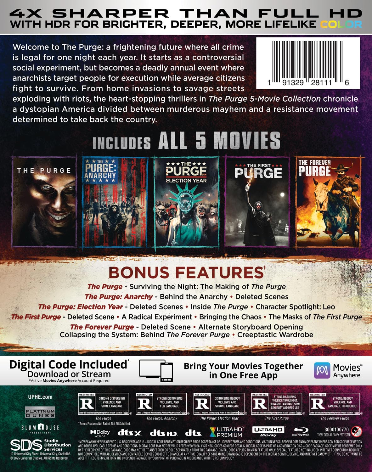Para los miembros de un movimiento clandestino, ya no es suficiente una noche anual de anarquía y asesinatos, así que deciden devolver a Estados Unidos el caos y las masacres sin fin, donde nadie volverá a estar a salvo… jamás. Adela (Ana de la Reguera) y su esposo Juan (Tenoch Huerta) viven en Texas, donde él trabaja como peón en un rancho para la adinerada familia Tucker. En la mañana después de la tradicional purga, una banda de asesinos enmascarados ataca violenta e ilegalmente a la familia Tucker, Tras este hecho, la familia texana se ve obligada a unirse con Juan y su esposa para enfrentar un país entero a punto de colapsar, que se hunde en un mar de caos y de sangre. Quinta y última entrega de la saga ‘The Purge’.